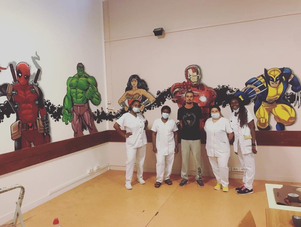 Nous avons fait appel a un artiste pour créer cette superbe fresque de « super héros » dans la cantine des enfants de l’hôpital Saint Maurice.